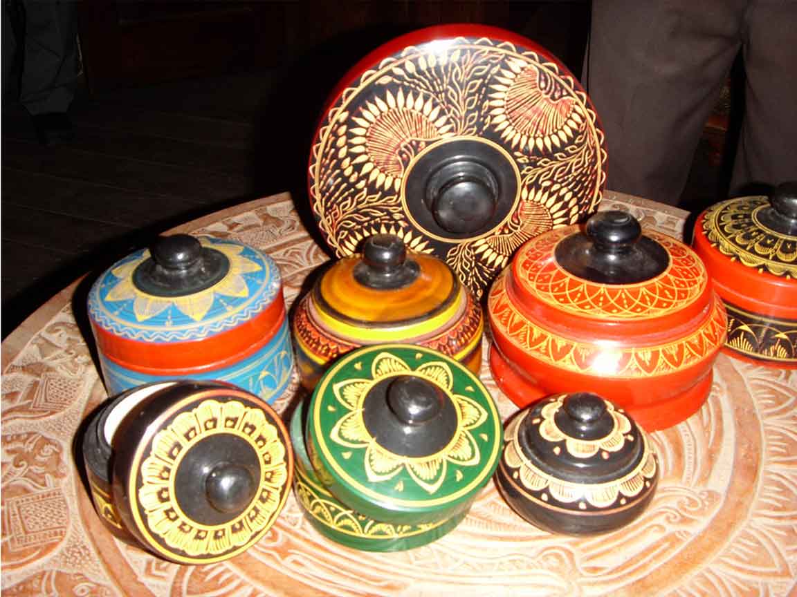 Laksha is the traditional form of creating intricate wooden decor using lacquer. Various decorative household items are crafted using resin harvested from the bark of lacquer beetle-infested trees. Once the resin is scraped off the bark, it is then melted down, strained and pigmented to required colours and left to dry. Once dried, the lacquer is applied using either one of the following techniques. Beeralu Veda or spool-work places the wooden base on a lathe and is applied using an angled lacquer stick while the lathe spins. This method depends on the lacquer melting due to the friction caused by the spinning which melts the lacquer allowing it to seep into the wood giving it a lasting glossy coating. Niyapothu Veda or nail-work uses heated lacquer drawn into a fine thread, layered into intricate patterns and covered in varnish. This technique is popularly found in the village of Palle Hapuvida, Matale. These beautiful wooden works of art can be found as walking sticks, bowls, vases, ashtrays, containers and more islandwide.