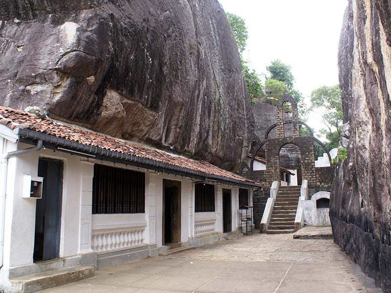 Three kilometres from the town of Matale, which lies at the foothills of the Knuckles Mountain Range known as Wiltshire, is the historical Aluviharaya Rock Temple, pouched between boulders and cliffs, where the teachings of the Buddha were transcribed into text on Ola (palm) leaves. The monastic caves contain unique murals and inscriptions; the main cave has a statue of the reclining Buddha accompanied by standing and seated images of the Buddha. Ascending to the site of the stupa at the summit of the rock renders an excellent view of the topography of the North Central Province.
